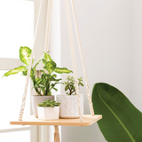 Bohemian-inspired shelf suspended by four high-quality, cotton macrame legs. This suspended Dreamer Shelf combines both art and style to bring character into your home and create a feature piece of your houseplants.